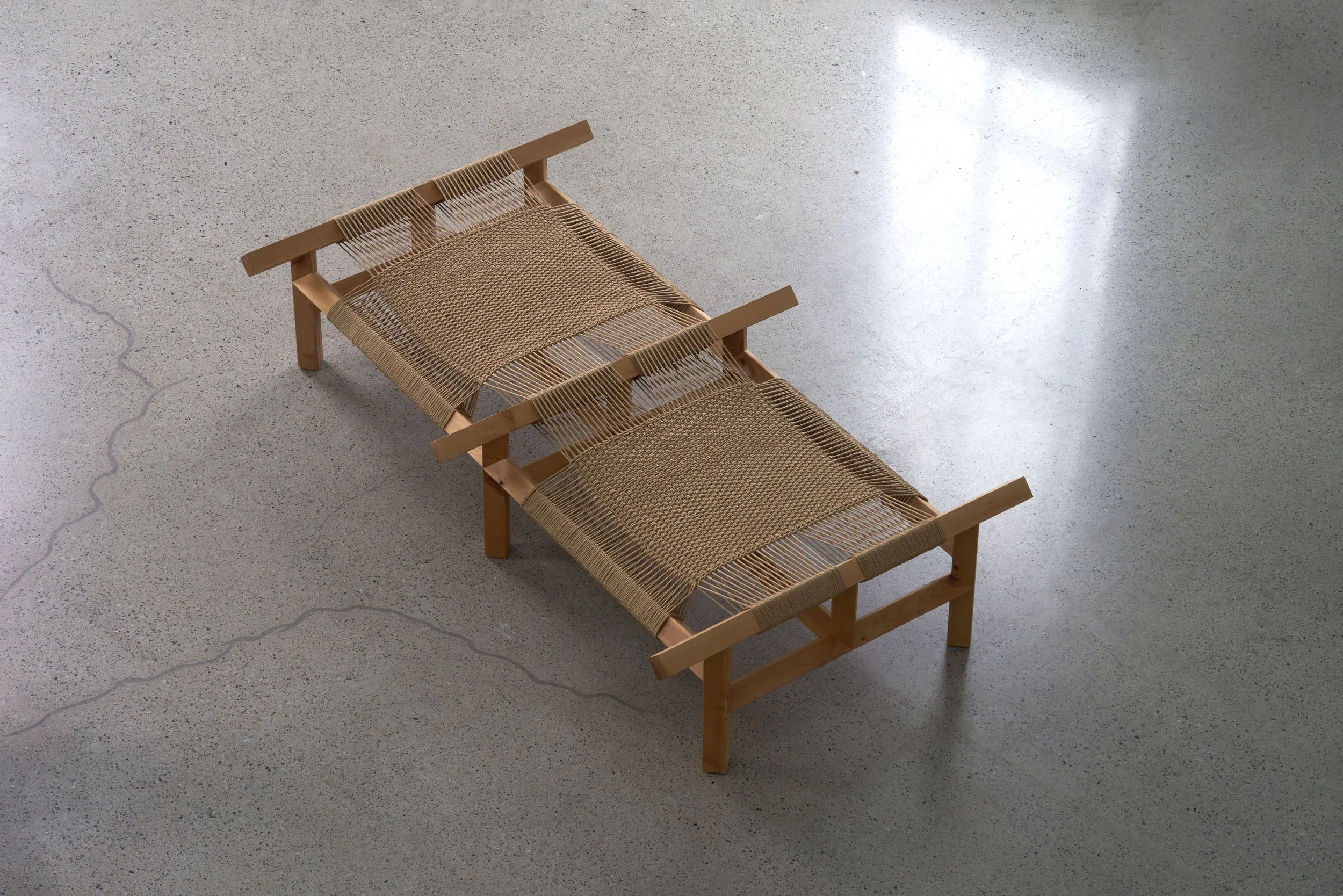 Verpa (2024) is a bench made from Norwegian black alder with a woven seat in paper yarn. It features two separate seats that invite use from both sides and can be placed in the center of a room. The bench has a recurring design element with square components tilted at 45 degrees, creating a light and stable structure. The design draws inspiration from traditional elements while challenging conventions around seating zones and joinery. Visually, Verpa evokes associations with Japanese architecture and roof structures, while the tilted components challenge traditional furniture design and provide unexpected spatial experiences.